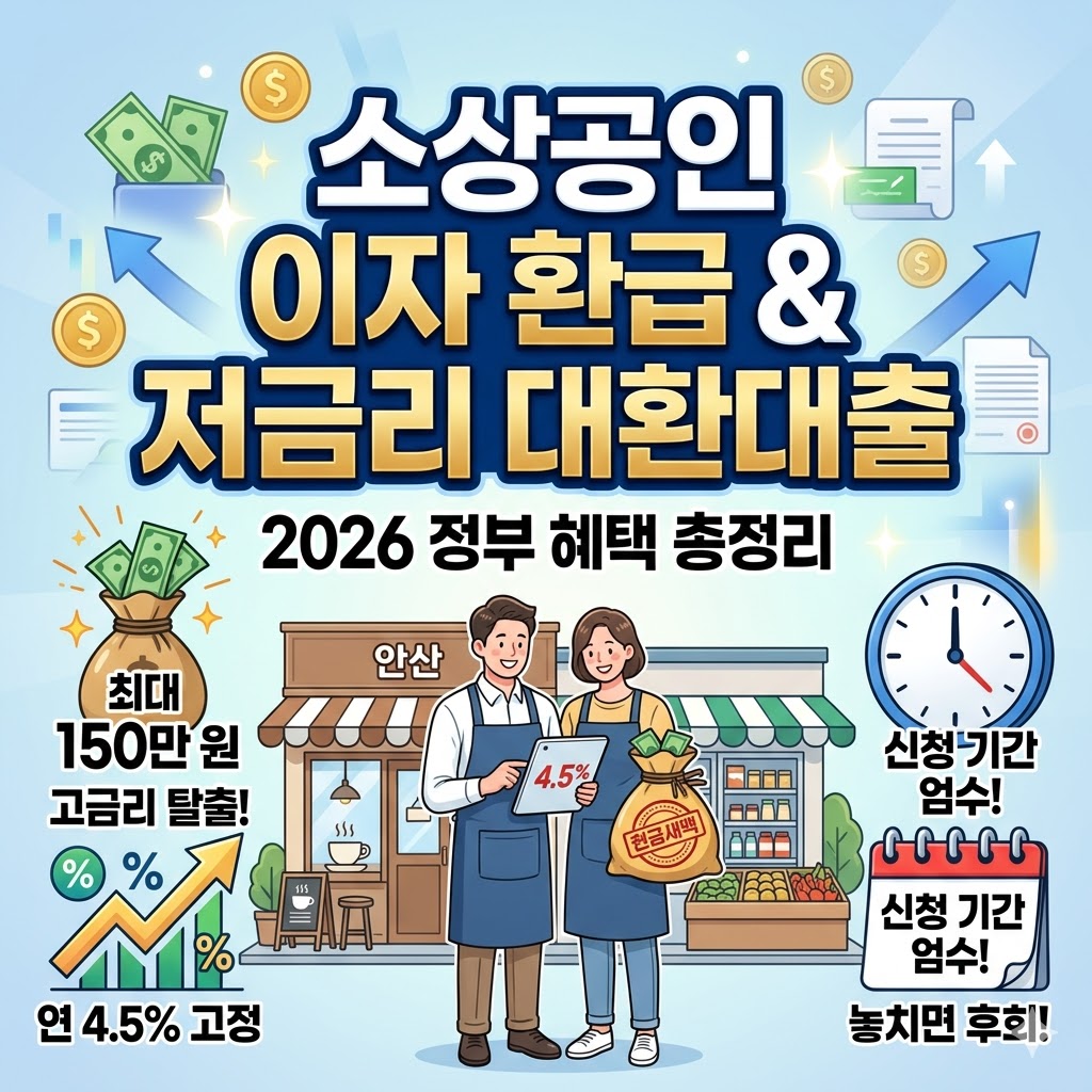 2026년 소상공인 금융 지원의 핵심은 **"고금리 부담 완화"**입니다. 7% 이상의 대출을 쓰고 있다면 4.5% 대환대출을, 제2금융권 대출자라면 최대 150만 원의 이자 환급을 반드시 체크하시기 바랍니다.