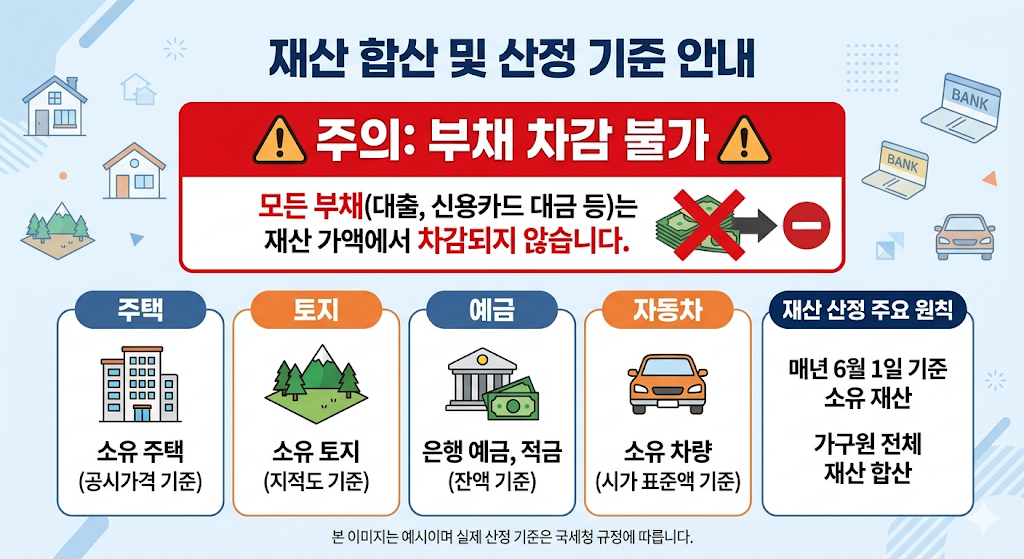 Q2. 자동차 가격도 재산에 포함되나요? 네, 포함됩니다. 보험개발원의 시가표준액을 기준으로 산정하며, 영업용 차량이 아닌 일반 승용차는 가구원 전체 재산 합계에 합산됩니다.